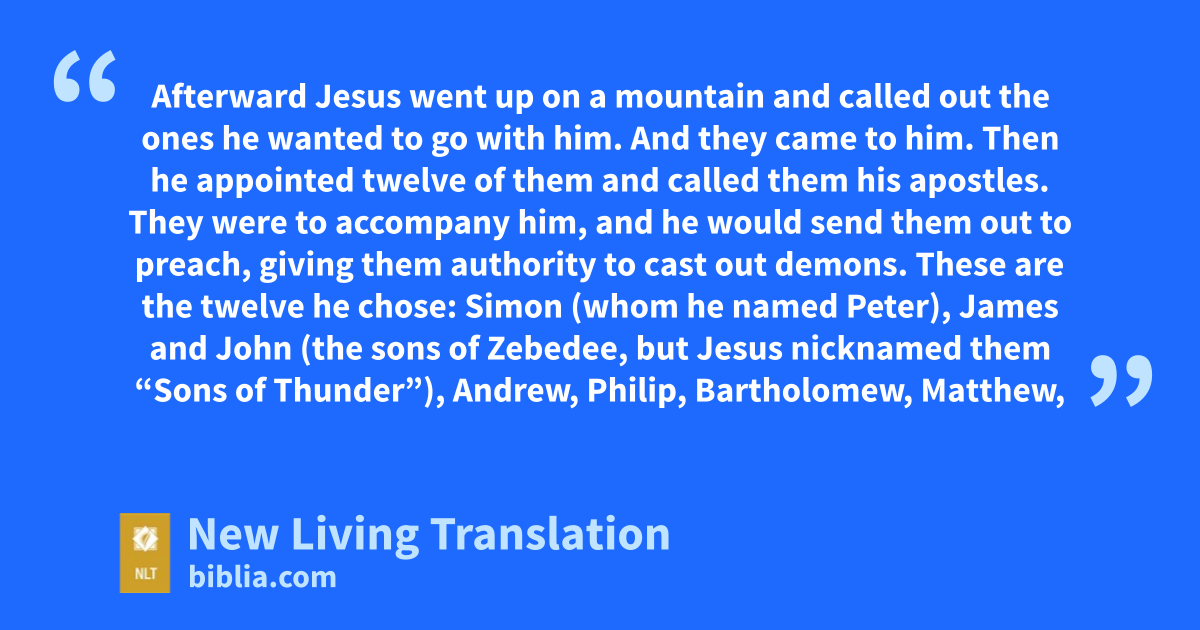 13 Afterward Jesus went up on a mountain and called out the ones he wanted to go with him. And they came to him. 14 Then he appointed twelve of them and called them his apostles.* They were to accompany him, and he would send them out to preach, 15 giving them authority to cast out demons. 16 These are the twelve he chose: