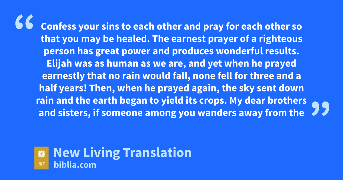 16 Confess your sins to each other and pray for each other so that you may be healed. The earnest prayer of a righteous person has great power and produces wonderful results. 17 Elijah was as human as we are, and yet when he prayed earnestly that no rain would fall, none fell for three and a half years! 18 Then, when he prayed again, the sky sent down rain and the earth began to yield its crops.