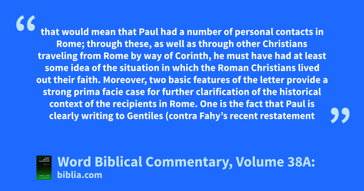 that would mean that Paul had a number of personal contacts in Rome; through these, as well as through other Christians traveling from Rome by way of Corinth, he must have had at least some idea of the situation in which the Roman Christians lived out their faith. Moreover, two basic features of the letter provide a strong prima facie case for further clarification of the historical context of the recipients in Rome. One is the fact that Paul is clearly writing to Gentiles (contra Fahy’s recent restatement