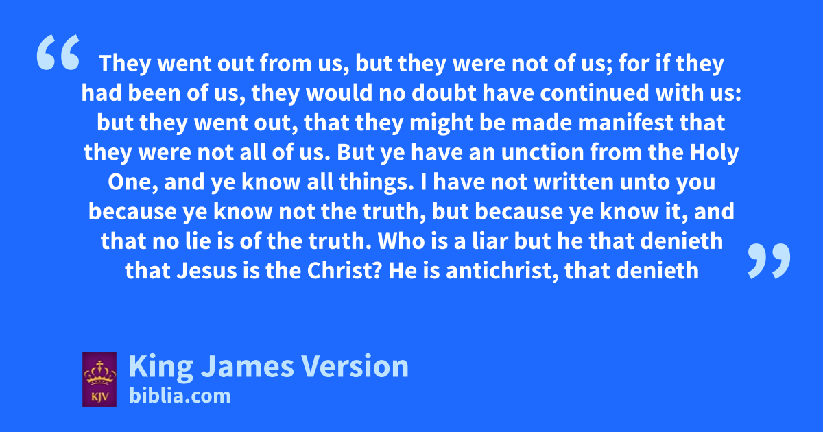 12 I write unto you, little children, because zyour sins are forgiven you for his name’s sake. 13 I write unto you, fathers, because ye have known ahim that is from the beginning. I write unto you, young men, because ye have overcome bthe wicked one. I write unto you, clittle children, because ye have known the Father. 14 I have written unto you, fathers, because ye have known ahim that is from the beginning. I have written unto you, young men, because dye are strong, and the word of God abideth in you, and ye have overcome bthe wicked one. 15 eLove not the world, neither the things that are in the world. fIf any man love the world, the love of the Father is not in him. 16 For all that is in the world, gthe lust of the flesh, and hthe lust of the eyes, and ithe pride of life, is not of the Father, but is of the world. 17 And kthe world passeth away, and the lust thereof: but he that doeth lthe will of God abideth for ever. 18 cLittle children, mit is the last time: and as ye have heard that nantichrist shall come, even now are there omany antichrists; whereby we know mthat it is the last time. 19 pThey went out from us, but they were not of us; for if they had been of us, qthey would no doubt have continued with us: but they went out, rthat they might be made manifest that they were not sall of us. 20 But ye have tan unction from uthe Holy One, and vye know all things. 21 I have not written unto you because ye know not the truth, but because xye know it, and that no lie is of the truth. 22 Who is a liar but yhe that denieth that Jesus is the Christ? He is nantichrist, that zdenieth the Father and the Son. 23 aWhosoever zdenieth the Son, the same bhath not the Father: (but) che that acknowledgeth the Son bhath the Father also. 24 Let that therefore abide in you, dwhich ye have heard from the beginning. If that dwhich ye have heard from the beginning shall remain in you, eye also shall continue in the Son, and in the Father. 25 And this is the promise that he hath promised us, even feternal life. 26 These things have I written unto you concerning gthem that seduce you. 27 But hthe anointing which ye have received of him abideth in you, and iye need not that any man teach you: but as the same anointing hjteacheth you of all things, and kis truth, and is no lie, and even as it hath taught you, lye shall abide in ||him. 28 And now, little children, abide in him; that, mwhen he shall appear, nwe may have confidence, and onot be ashamed pbefore him qat his coming. 29 If ye know that rhe is righteous, ||ye know that severy one that doeth righteousness is born of him.