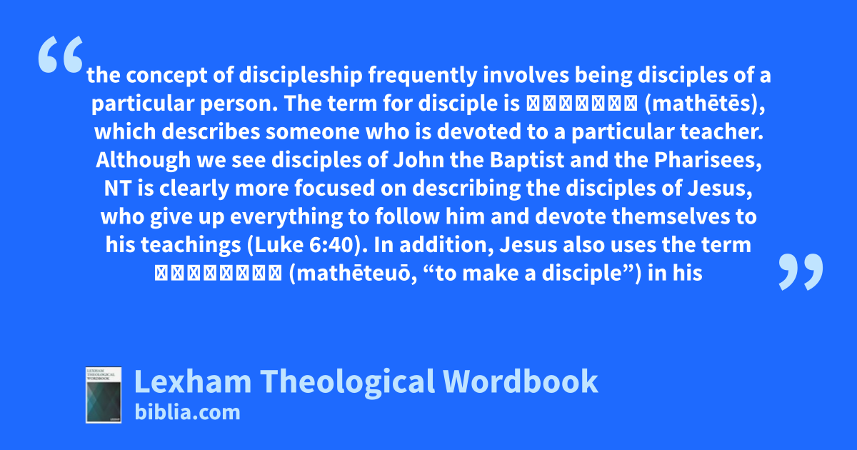 the concept of discipleship frequently involves being disciples of a particular person. The term for disciple is μαθητής (mathētēs), which describes someone who is devoted to a particular teacher. Although we see disciples of John the Baptist and the Pharisees, NT is clearly more focused on describing the disciples of Jesus, who give up everything to follow him and devote themselves to his teachings (Luke 6:40). In addition, Jesus also uses the term μαθητεύω (mathēteuō, “to make a disciple”) in his