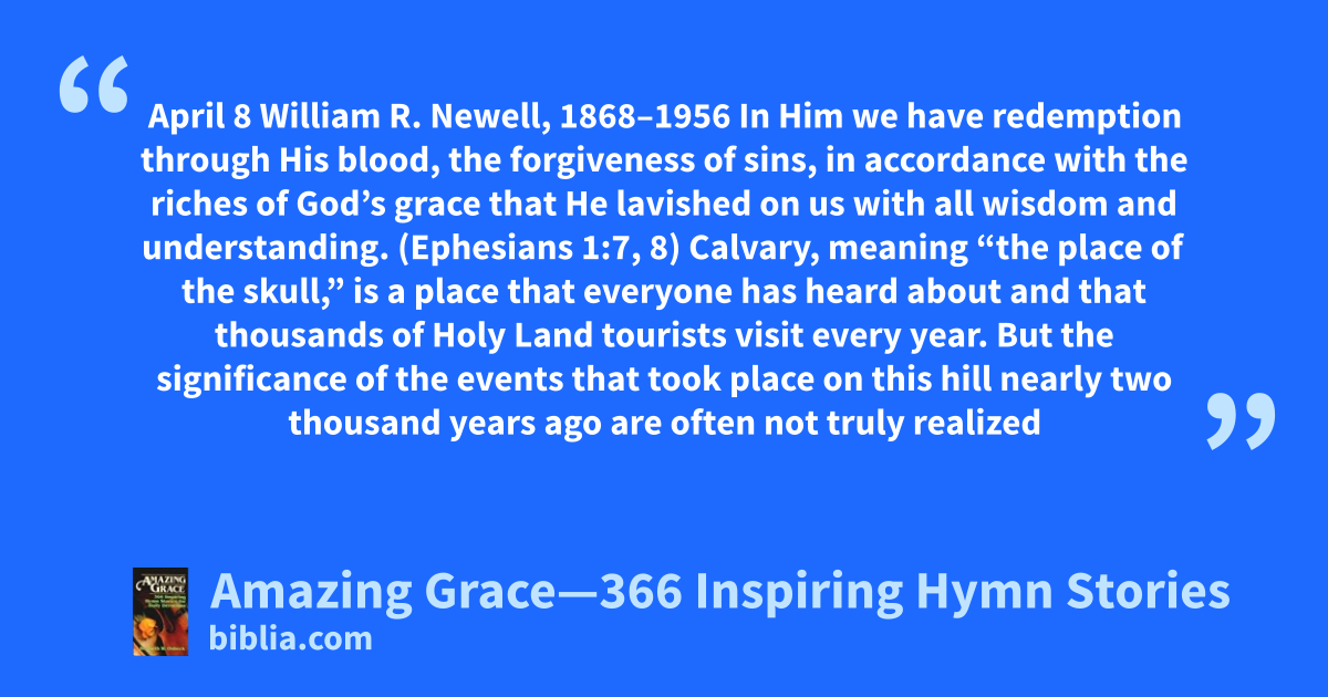 April 8 William R. Newell, 1868–1956 In Him we have redemption through His blood, the forgiveness of sins, in accordance with the riches of God’s grace that He lavished on us with all wisdom and understanding. (Ephesians 1:7, 8) Calvary, meaning “the place of the skull,” is a place that everyone has heard about and that thousands of Holy Land tourists visit every year. But the significance of the events that took place on this hill nearly two thousand years ago are often not truly realized