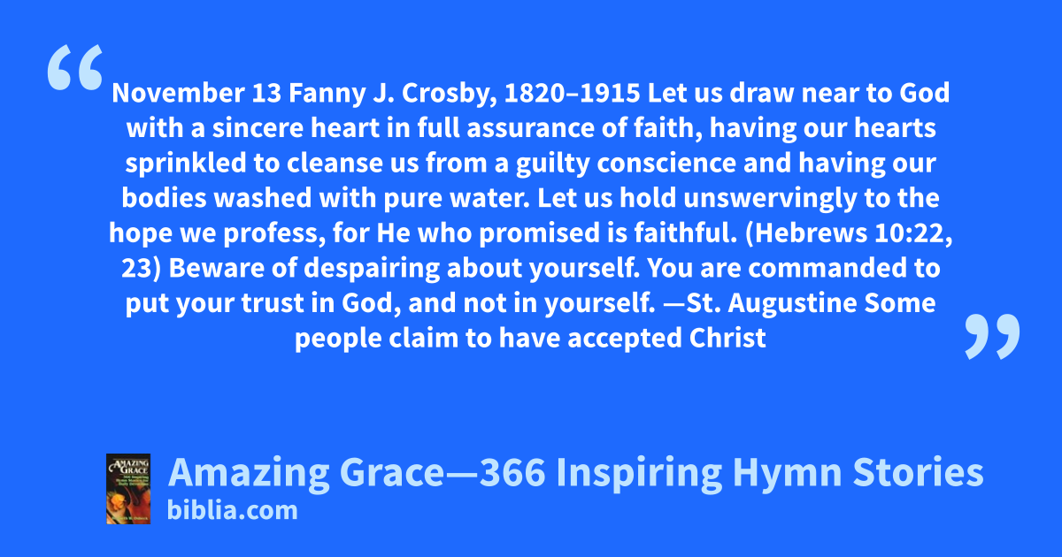 November 13 Fanny J. Crosby, 1820–1915 Let us draw near to God with a sincere heart in full assurance of faith, having our hearts sprinkled to cleanse us from a guilty conscience and having our bodies washed with pure water. Let us hold unswervingly to the hope we profess, for He who promised is faithful. (Hebrews 10:22, 23) Beware of despairing about yourself. You are commanded to put your trust in God, and not in yourself. —St. Augustine Some people claim to have accepted Christ