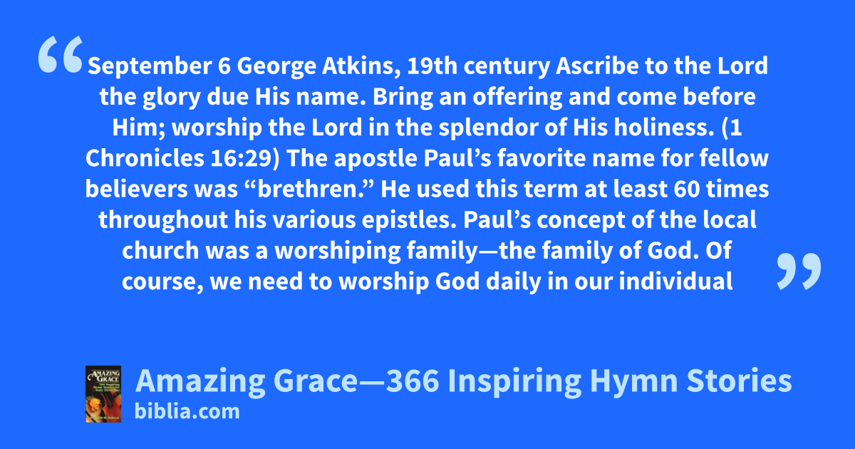 September 6 George Atkins, 19th century Ascribe to the Lord the glory due His name. Bring an offering and come before Him; worship the Lord in the splendor of His holiness. (1 Chronicles 16:29) The apostle Paul’s favorite name for fellow believers was “brethren.” He used this term at least 60 times throughout his various epistles. Paul’s concept of the local church was a worshiping family—the family of God. Of course, we need to worship God daily in our individual