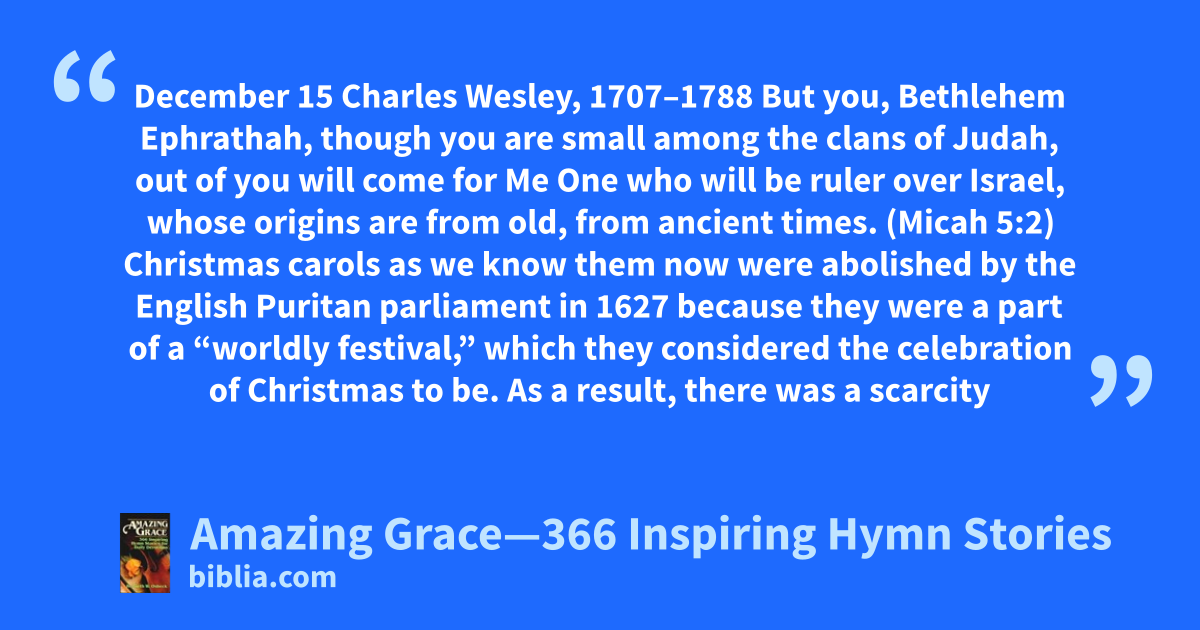 December 15 Charles Wesley, 1707–1788 But you, Bethlehem Ephrathah, though you are small among the clans of Judah, out of you will come for Me One who will be ruler over Israel, whose origins are from old, from ancient times. (Micah 5:2) Christmas carols as we know them now were abolished by the English Puritan parliament in 1627 because they were a part of a “worldly festival,” which they considered the celebration of Christmas to be. As a result, there was a scarcity