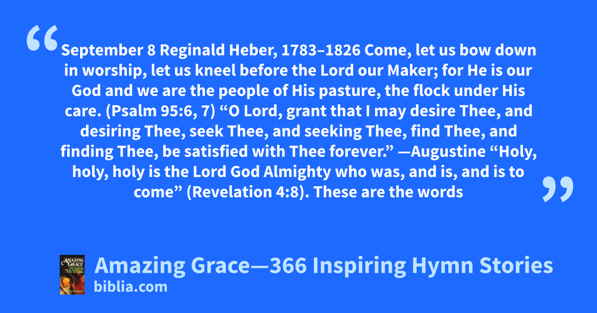 September 8 Reginald Heber, 1783–1826 Come, let us bow down in worship, let us kneel before the Lord our Maker; for He is our God and we are the people of His pasture, the flock under His care. (Psalm 95:6, 7) “O Lord, grant that I may desire Thee, and desiring Thee, seek Thee, and seeking Thee, find Thee, and finding Thee, be satisfied with Thee forever.” —Augustine “Holy, holy, holy is the Lord God Almighty who was, and is, and is to come” (Revelation 4:8). These are the words