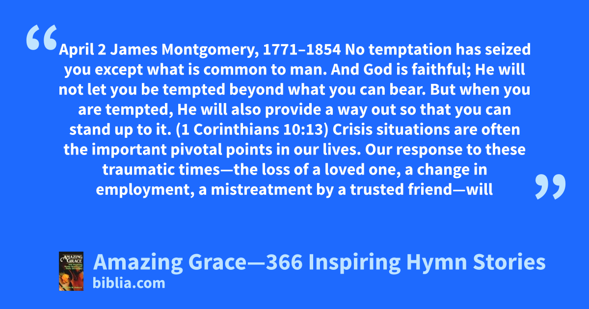 April 2 James Montgomery, 1771–1854 No temptation has seized you except what is common to man. And God is faithful; He will not let you be tempted beyond what you can bear. But when you are tempted, He will also provide a way out so that you can stand up to it. (1 Corinthians 10:13) Crisis situations are often the important pivotal points in our lives. Our response to these traumatic times—the loss of a loved one, a change in employment, a mistreatment by a trusted friend—will