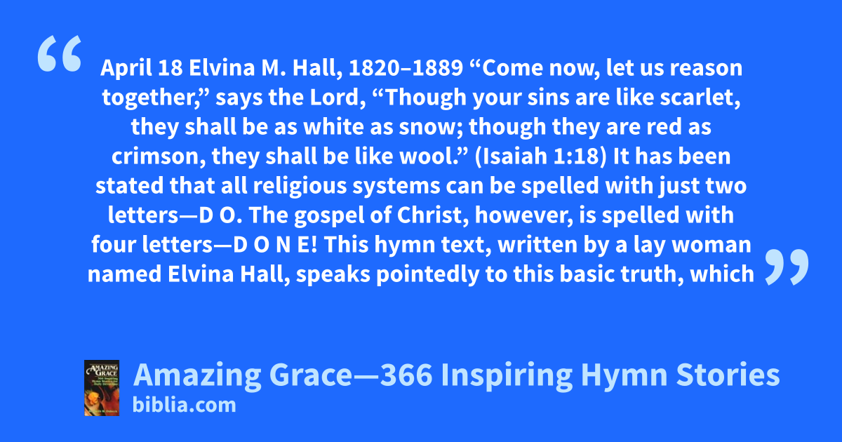 April 18 Elvina M. Hall, 1820–1889 “Come now, let us reason together,” says the Lord, “Though your sins are like scarlet, they shall be as white as snow; though they are red as crimson, they shall be like wool.” (Isaiah 1:18) It has been stated that all religious systems can be spelled with just two letters—D O. The gospel of Christ, however, is spelled with four letters—D O N E! This hymn text, written by a lay woman named Elvina Hall, speaks pointedly to this basic truth, which