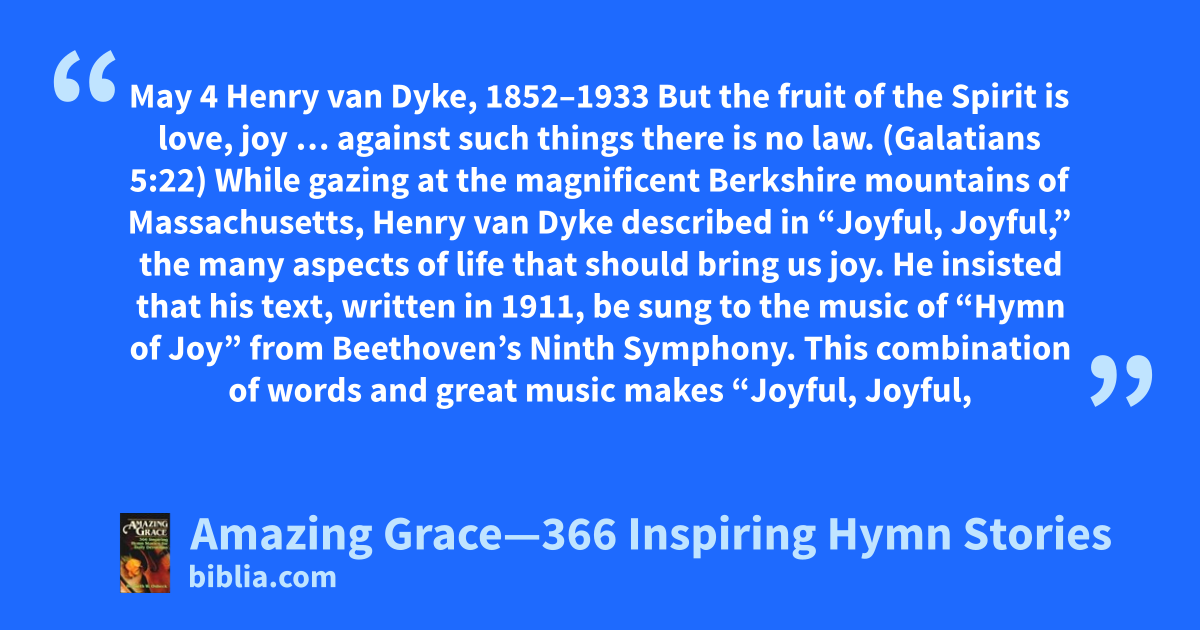 May 4 Henry van Dyke, 1852–1933 But the fruit of the Spirit is love, joy … against such things there is no law. (Galatians 5:22) While gazing at the magnificent Berkshire mountains of Massachusetts, Henry van Dyke described in “Joyful, Joyful,” the many aspects of life that should bring us joy. He insisted that his text, written in 1911, be sung to the music of “Hymn of Joy” from Beethoven’s Ninth Symphony. This combination of words and great music makes “Joyful, Joyful,