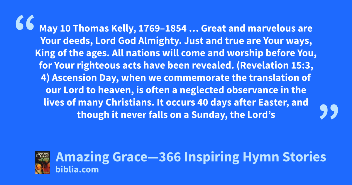 May 10 Thomas Kelly, 1769–1854 … Great and marvelous are Your deeds, Lord God Almighty. Just and true are Your ways, King of the ages. All nations will come and worship before You, for Your righteous acts have been revealed. (Revelation 15:3, 4) Ascension Day, when we commemorate the translation of our Lord to heaven, is often a neglected observance in the lives of many Christians. It occurs 40 days after Easter, and though it never falls on a Sunday, the Lord’s