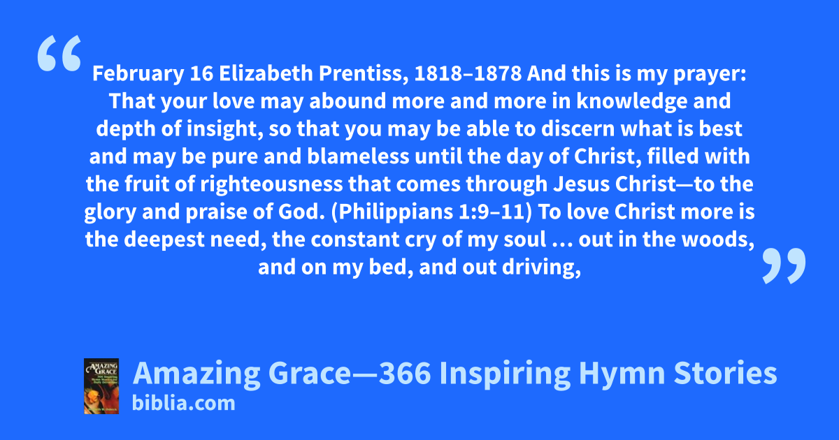 February 16 Elizabeth Prentiss, 1818–1878 And this is my prayer: That your love may abound more and more in knowledge and depth of insight, so that you may be able to discern what is best and may be pure and blameless until the day of Christ, filled with the fruit of righteousness that comes through Jesus Christ—to the glory and praise of God. (Philippians 1:9–11) To love Christ more is the deepest need, the constant cry of my soul … out in the woods, and on my bed, and out driving,
