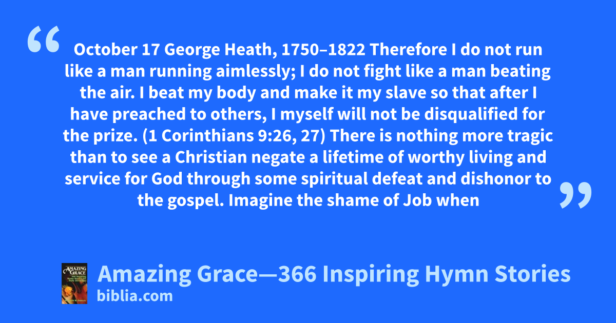 October 17 George Heath, 1750–1822 Therefore I do not run like a man running aimlessly; I do not fight like a man beating the air. I beat my body and make it my slave so that after I have preached to others, I myself will not be disqualified for the prize. (1 Corinthians 9:26, 27) There is nothing more tragic than to see a Christian negate a lifetime of worthy living and service for God through some spiritual defeat and dishonor to the gospel. Imagine the shame of Job when