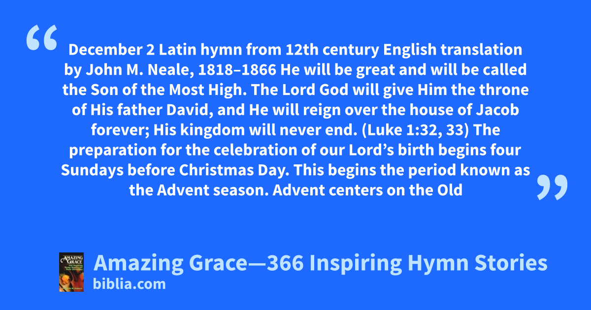 December 2 Latin hymn from 12th century English translation by John M. Neale, 1818–1866 He will be great and will be called the Son of the Most High. The Lord God will give Him the throne of His father David, and He will reign over the house of Jacob forever; His kingdom will never end. (Luke 1:32, 33) The preparation for the celebration of our Lord’s birth begins four Sundays before Christmas Day. This begins the period known as the Advent season. Advent centers on the Old