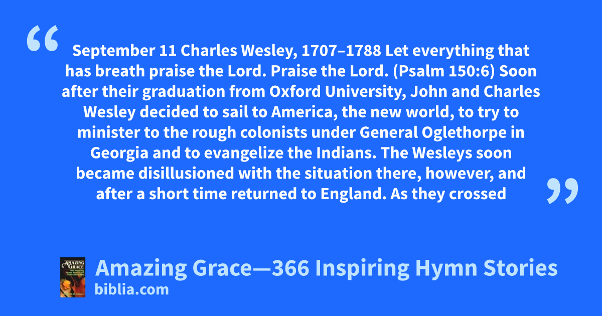 September 11 Charles Wesley, 1707–1788 Let everything that has breath praise the Lord. Praise the Lord. (Psalm 150:6) Soon after their graduation from Oxford University, John and Charles Wesley decided to sail to America, the new world, to try to minister to the rough colonists under General Oglethorpe in Georgia and to evangelize the Indians. The Wesleys soon became disillusioned with the situation there, however, and after a short time returned to England. As they crossed