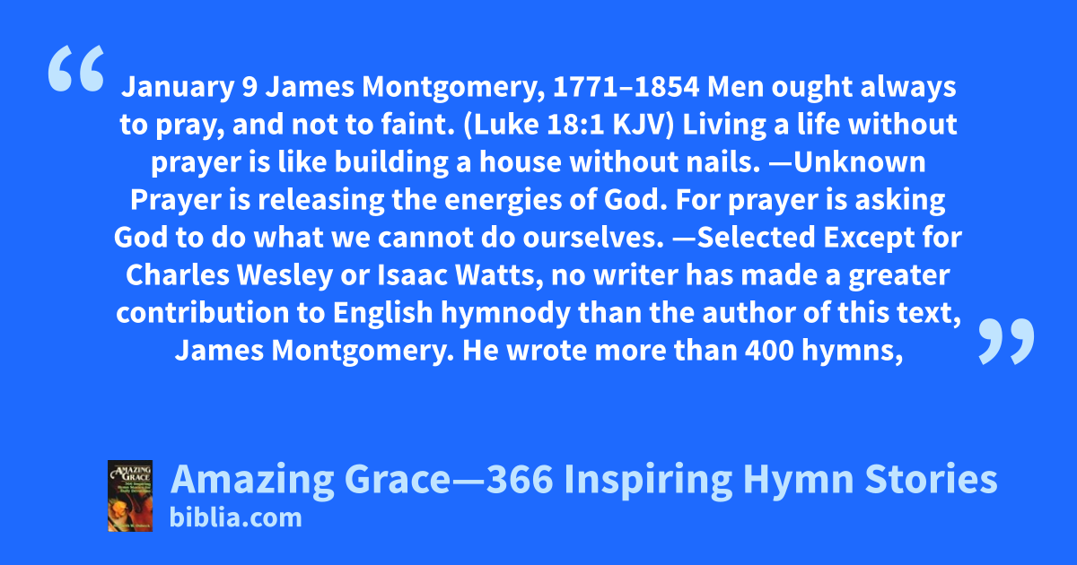 January 9 James Montgomery, 1771–1854 Men ought always to pray, and not to faint. (Luke 18:1 KJV) Living a life without prayer is like building a house without nails. —Unknown Prayer is releasing the energies of God. For prayer is asking God to do what we cannot do ourselves. —Selected Except for Charles Wesley or Isaac Watts, no writer has made a greater contribution to English hymnody than the author of this text, James Montgomery. He wrote more than 400 hymns,