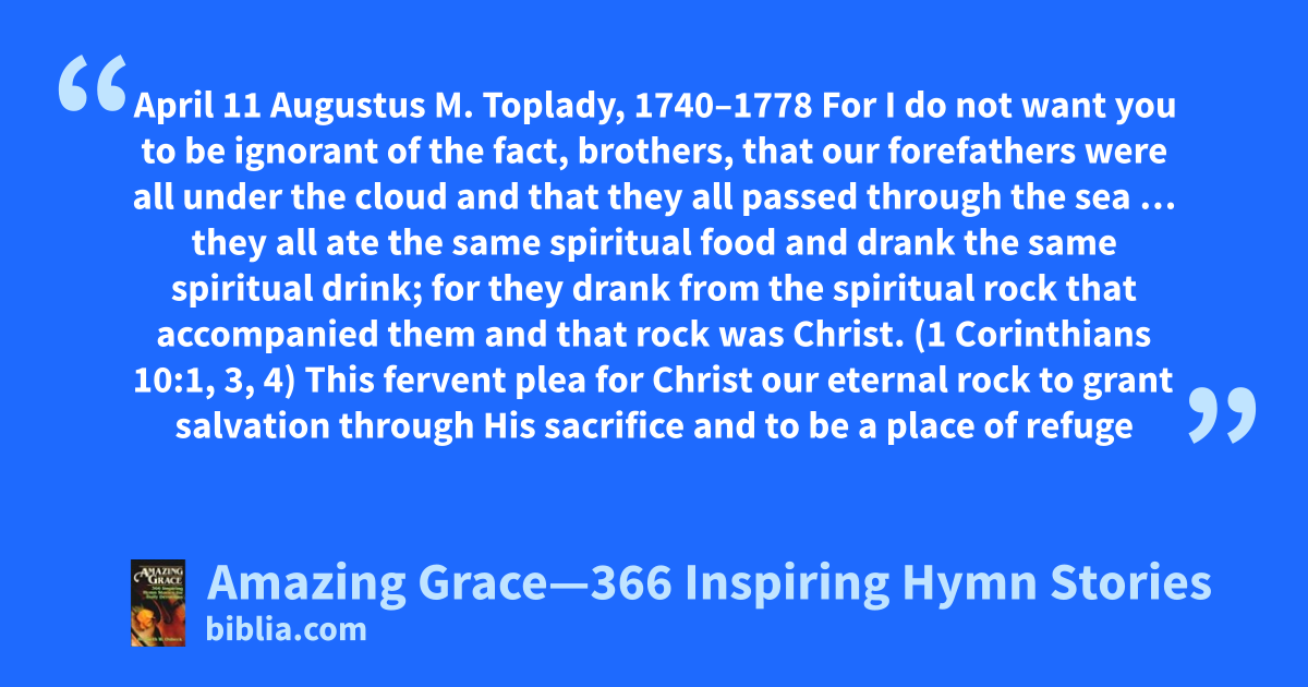 April 11 Augustus M. Toplady, 1740–1778 For I do not want you to be ignorant of the fact, brothers, that our forefathers were all under the cloud and that they all passed through the sea … they all ate the same spiritual food and drank the same spiritual drink; for they drank from the spiritual rock that accompanied them and that rock was Christ. (1 Corinthians 10:1, 3, 4) This fervent plea for Christ our eternal rock to grant salvation through His sacrifice and to be a place of refuge