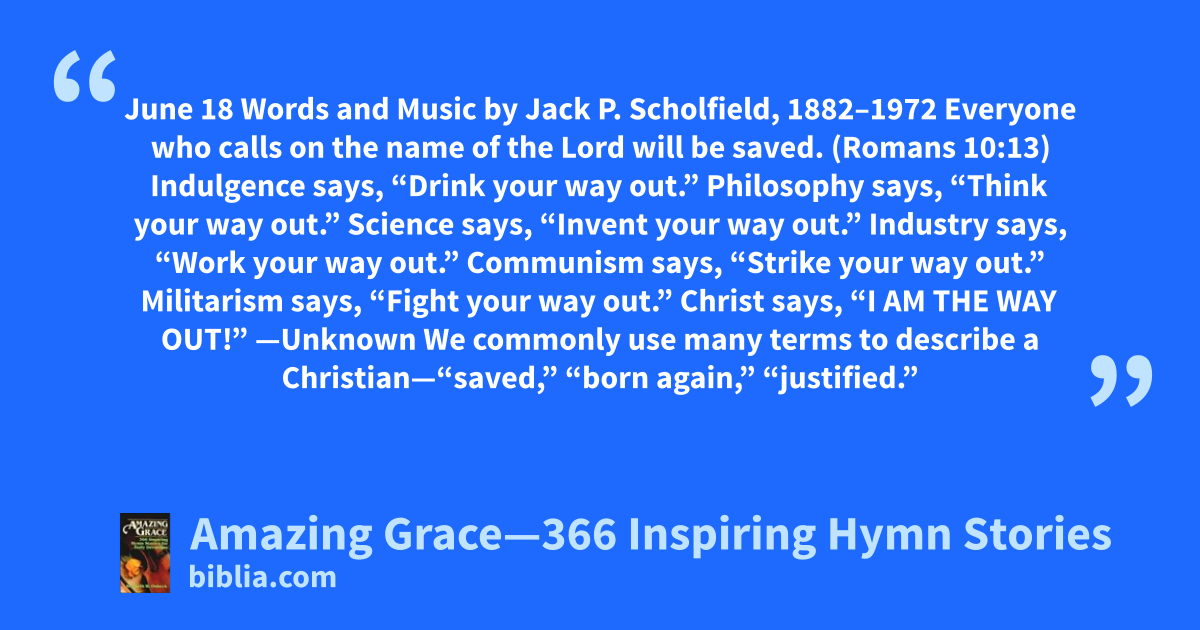 June 18 Words and Music by Jack P. Scholfield, 1882–1972 Everyone who calls on the name of the Lord will be saved. (Romans 10:13) Indulgence says, “Drink your way out.” Philosophy says, “Think your way out.” Science says, “Invent your way out.” Industry says, “Work your way out.” Communism says, “Strike your way out.” Militarism says, “Fight your way out.” Christ says, “I AM THE WAY OUT!” —Unknown We commonly use many terms to describe a Christian—“saved,” “born again,” “justified.”