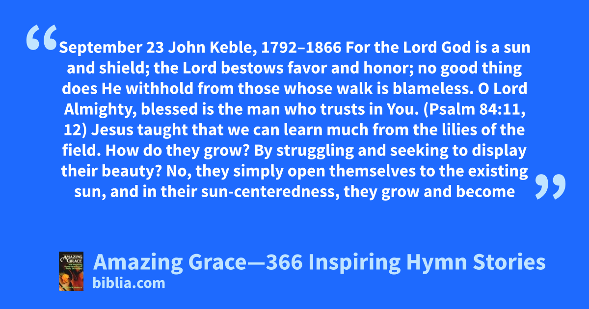 September 23 John Keble, 1792–1866 For the Lord God is a sun and shield; the Lord bestows favor and honor; no good thing does He withhold from those whose walk is blameless. O Lord Almighty, blessed is the man who trusts in You. (Psalm 84:11, 12) Jesus taught that we can learn much from the lilies of the field. How do they grow? By struggling and seeking to display their beauty? No, they simply open themselves to the existing sun, and in their sun-centeredness, they grow and become