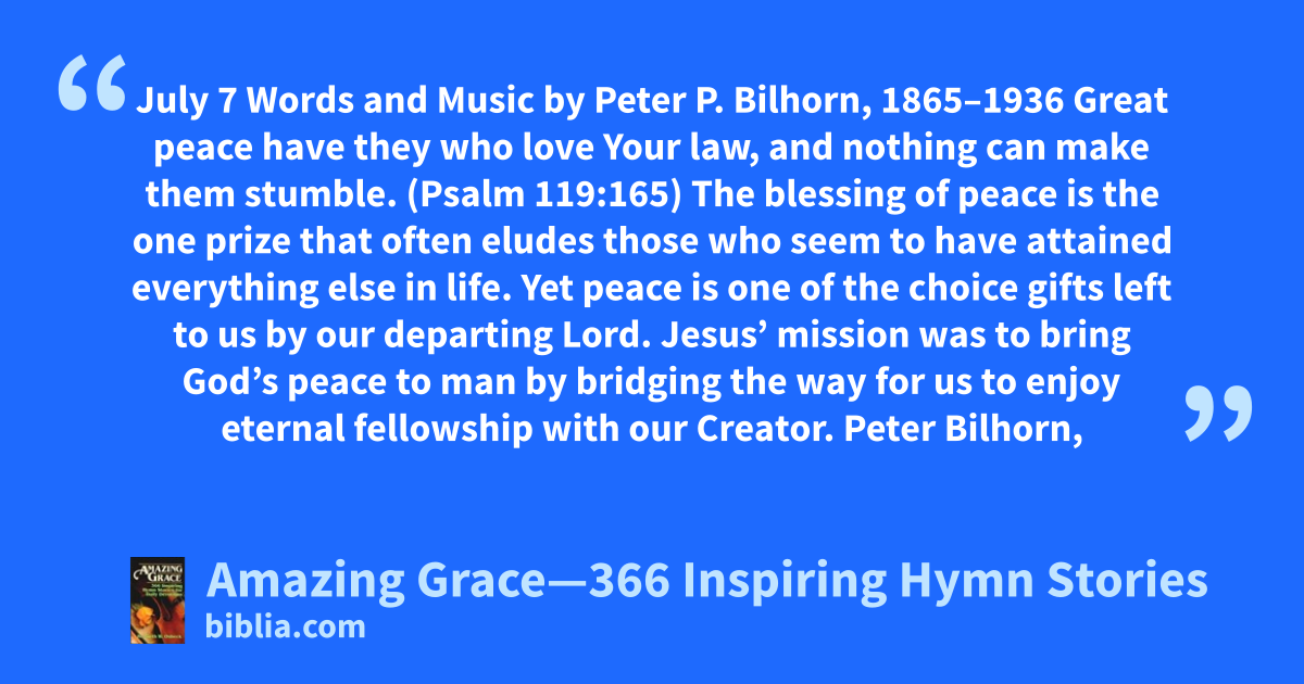 July 7 Words and Music by Peter P. Bilhorn, 1865–1936 Great peace have they who love Your law, and nothing can make them stumble. (Psalm 119:165) The blessing of peace is the one prize that often eludes those who seem to have attained everything else in life. Yet peace is one of the choice gifts left to us by our departing Lord. Jesus’ mission was to bring God’s peace to man by bridging the way for us to enjoy eternal fellowship with our Creator. Peter Bilhorn,