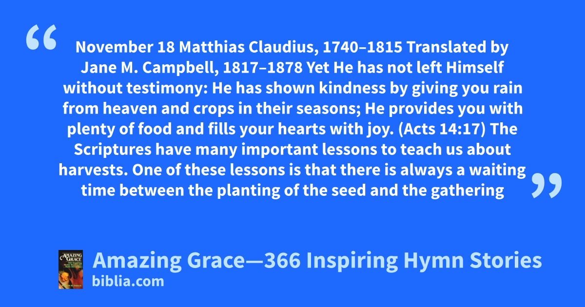 November 18 Matthias Claudius, 1740–1815 Translated by Jane M. Campbell, 1817–1878 Yet He has not left Himself without testimony: He has shown kindness by giving you rain from heaven and crops in their seasons; He provides you with plenty of food and fills your hearts with joy. (Acts 14:17) The Scriptures have many important lessons to teach us about harvests. One of these lessons is that there is always a waiting time between the planting of the seed and the gathering