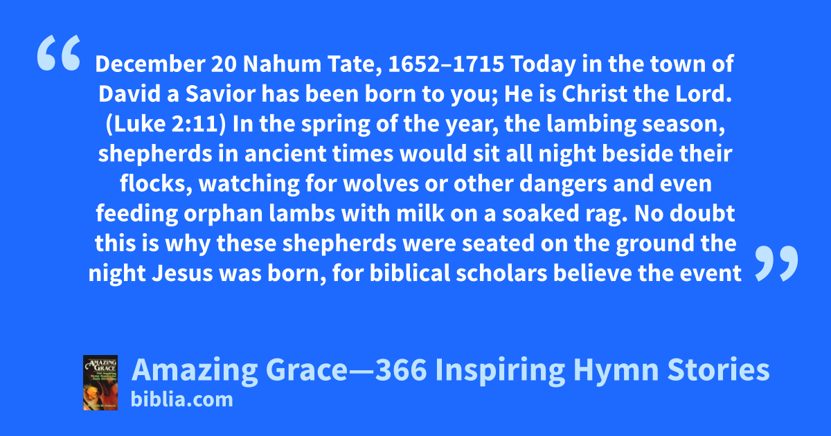 December 20 Nahum Tate, 1652–1715 Today in the town of David a Savior has been born to you; He is Christ the Lord. (Luke 2:11) In the spring of the year, the lambing season, shepherds in ancient times would sit all night beside their flocks, watching for wolves or other dangers and even feeding orphan lambs with milk on a soaked rag. No doubt this is why these shepherds were seated on the ground the night Jesus was born, for biblical scholars believe the event