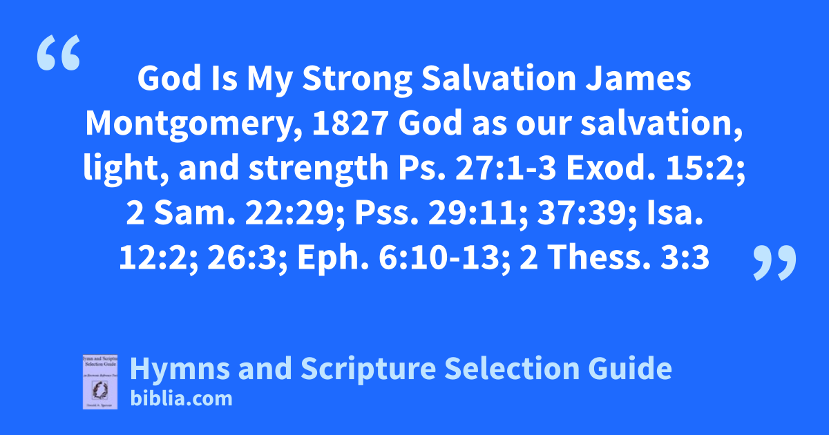 God Is My Strong Salvation James Montgomery, 1827 God as our salvation, light, and strength Ps. 27:1-3 Exod. 15:2; 2 Sam. 22:29; Pss. 29:11; 37:39; Isa. 12:2; 26:3; Eph. 6:10-13; 2 Thess. 3:3