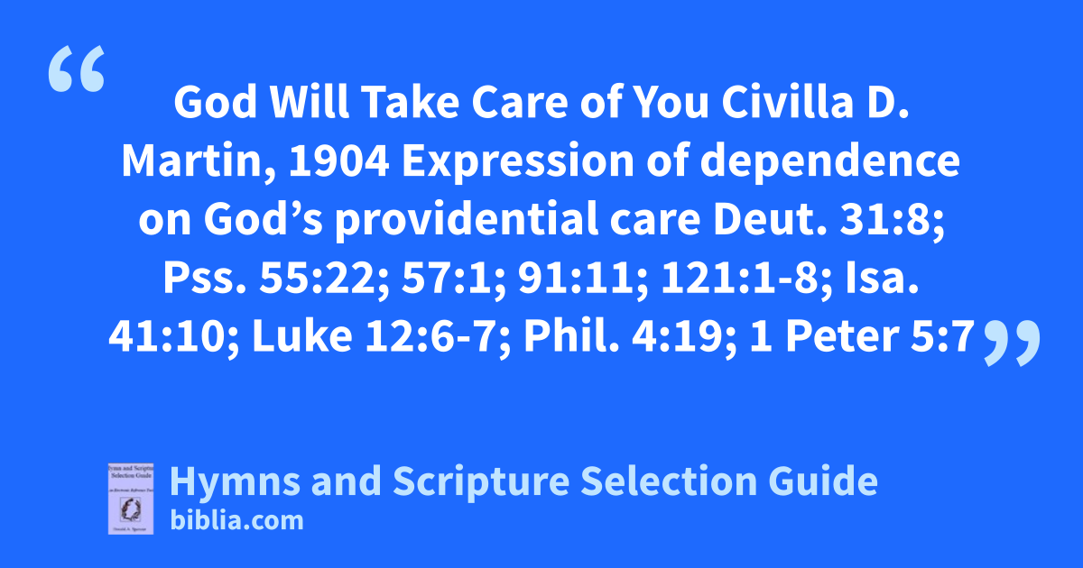 God Will Take Care of You Civilla D. Martin, 1904 Expression of dependence on God’s providential care Deut. 31:8; Pss. 55:22; 57:1; 91:11; 121:1-8; Isa. 41:10; Luke 12:6-7; Phil. 4:19; 1 Peter 5:7