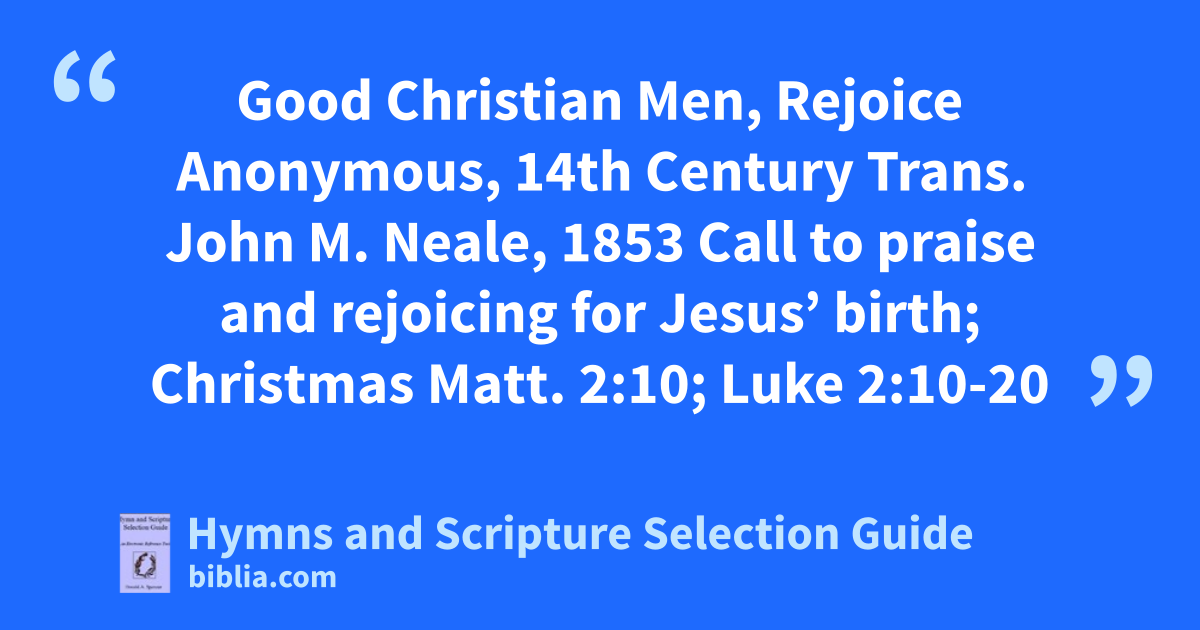 Good Christian Men, Rejoice Anonymous, 14th Century Trans. John M. Neale, 1853 Call to praise and rejoicing for Jesus’ birth; Christmas Matt. 2:10; Luke 2:10-20