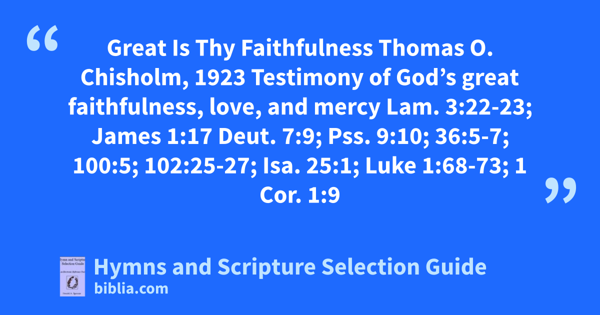 Great Is Thy Faithfulness Thomas O. Chisholm, 1923 Testimony of God’s great faithfulness, love, and mercy Lam. 3:22-23; James 1:17 Deut. 7:9; Pss. 9:10; 36:5-7; 100:5; 102:25-27; Isa. 25:1; Luke 1:68-73; 1 Cor. 1:9