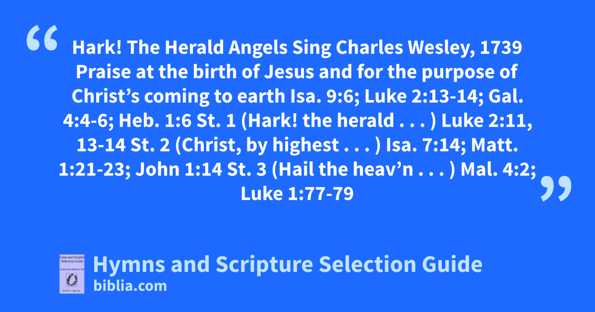 Hark! The Herald Angels Sing Charles Wesley, 1739 Praise at the birth of Jesus and for the purpose of Christ’s coming to earth Isa. 9:6; Luke 2:13-14; Gal. 4:4-6; Heb. 1:6 St. 1 (Hark! the herald . . . ) Luke 2:11, 13-14 St. 2 (Christ, by highest . . . ) Isa. 7:14; Matt. 1:21-23; John 1:14 St. 3 (Hail the heav’n . . . ) Mal. 4:2; Luke 1:77-79
