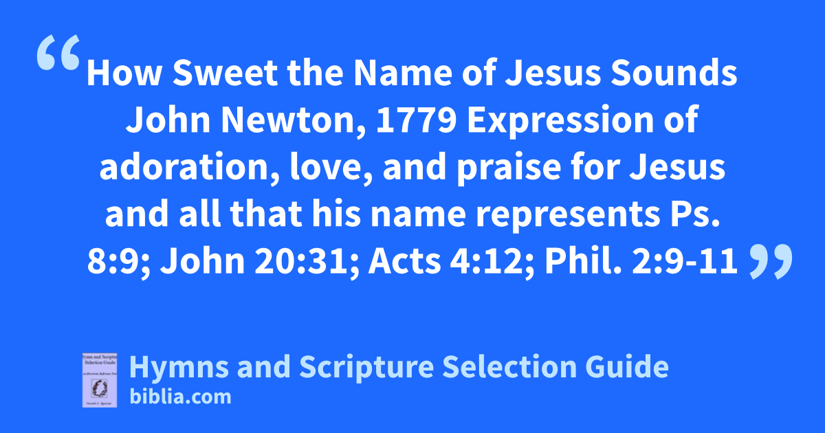 How Sweet the Name of Jesus Sounds John Newton, 1779 Expression of adoration, love, and praise for Jesus and all that his name represents Ps. 8:9; John 20:31; Acts 4:12; Phil. 2:9-11