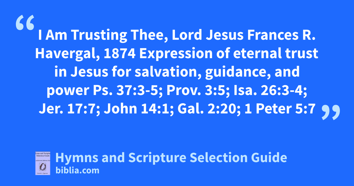 I Am Trusting Thee, Lord Jesus Frances R. Havergal, 1874 Expression of eternal trust in Jesus for salvation, guidance, and power Ps. 37:3-5; Prov. 3:5; Isa. 26:3-4; Jer. 17:7; John 14:1; Gal. 2:20; 1 Peter 5:7
