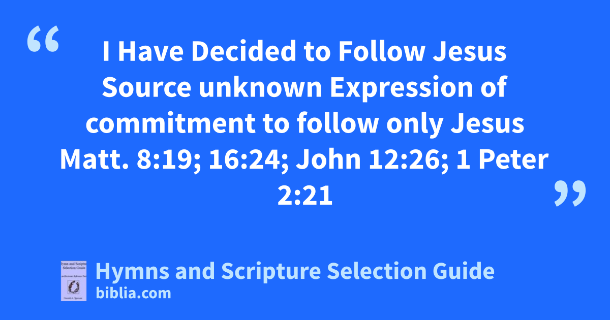 I Have Decided to Follow Jesus Source unknown Expression of commitment to follow only Jesus Matt. 8:19; 16:24; John 12:26; 1 Peter 2:21