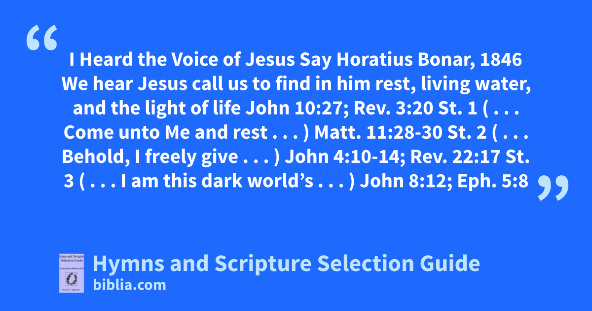 I Heard the Voice of Jesus Say Horatius Bonar, 1846 We hear Jesus call us to find in him rest, living water, and the light of life John 10:27; Rev. 3:20 St. 1 ( . . . Come unto Me and rest . . . ) Matt. 11:28-30 St. 2 ( . . . Behold, I freely give . . . ) John 4:10-14; Rev. 22:17 St. 3 ( . . . I am this dark world’s . . . ) John 8:12; Eph. 5:8