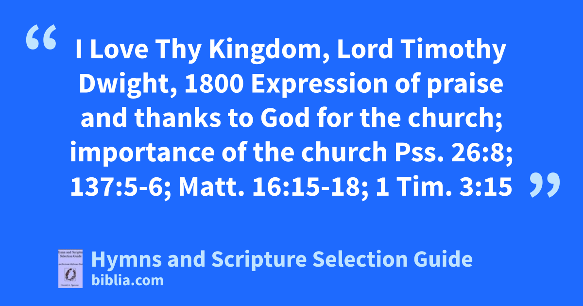 I Love Thy Kingdom, Lord Timothy Dwight, 1800 Expression of praise and thanks to God for the church; importance of the church Pss. 26:8; 137:5-6; Matt. 16:15-18; 1 Tim. 3:15