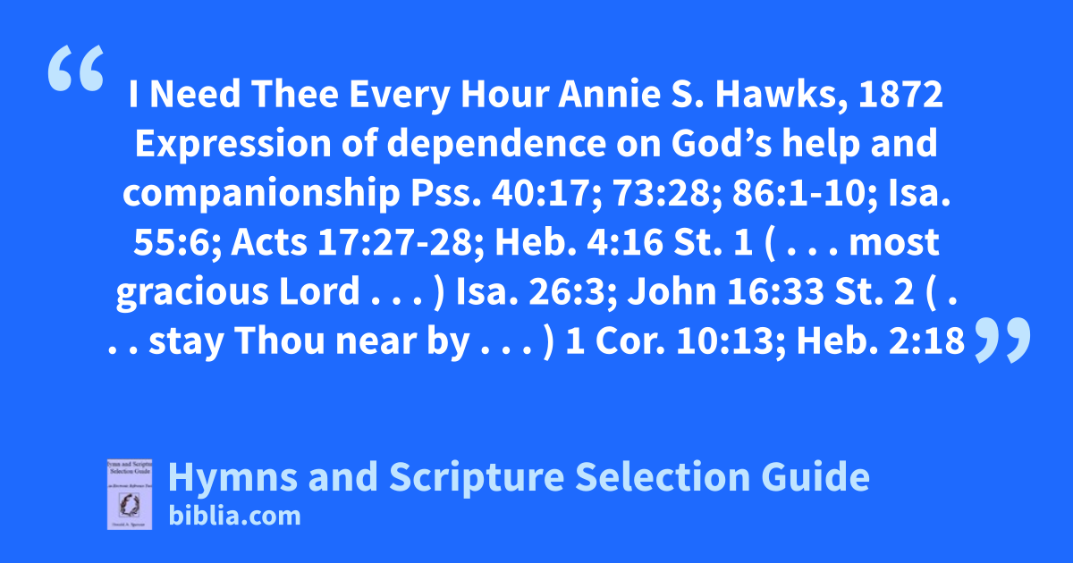 Hymn and Scripture Selection Guide - presents the 432 hymns in alphabetical order. The related Scripture passages, taken from the Old and New Testaments as commonly in use by American Protestant denominations, are listed under each hymn. Passages that are directly related to a hymn, such as paraphrases and direct quotations, are in boldface type. Under the title of each hymn in italics there are...