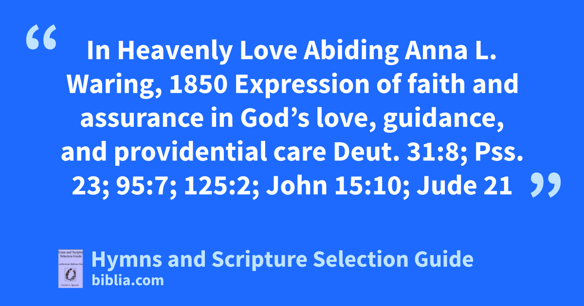 In Heavenly Love Abiding Anna L. Waring, 1850 Expression of faith and assurance in God’s love, guidance, and providential care Deut. 31:8; Pss. 23; 95:7; 125:2; John 15:10; Jude 21