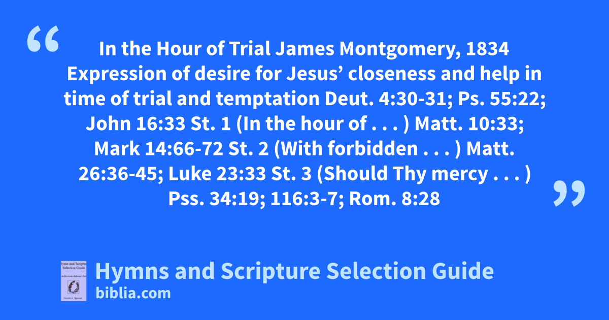 In the Hour of Trial James Montgomery, 1834 Expression of desire for Jesus’ closeness and help in time of trial and temptation Deut. 4:30-31; Ps. 55:22; John 16:33 St. 1 (In the hour of . . . ) Matt. 10:33; Mark 14:66-72 St. 2 (With forbidden . . . ) Matt. 26:36-45; Luke 23:33 St. 3 (Should Thy mercy . . . ) Pss. 34:19; 116:3-7; Rom. 8:28