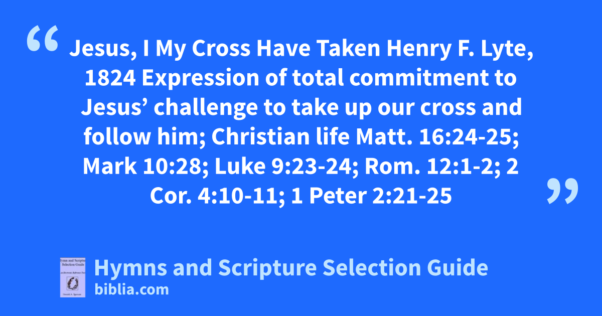 Jesus, I My Cross Have Taken Henry F. Lyte, 1824 Expression of total commitment to Jesus’ challenge to take up our cross and follow him; Christian life Matt. 16:24-25; Mark 10:28; Luke 9:23-24; Rom. 12:1-2; 2 Cor. 4:10-11; 1 Peter 2:21-25
