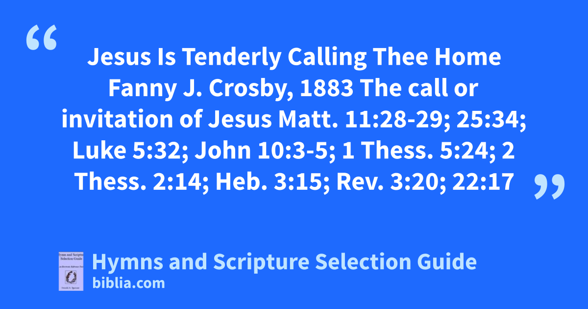 Jesus Is Tenderly Calling Thee Home Fanny J. Crosby, 1883 The call or invitation of Jesus Matt. 11:28-29; 25:34; Luke 5:32; John 10:3-5; 1 Thess. 5:24; 2 Thess. 2:14; Heb. 3:15; Rev. 3:20; 22:17