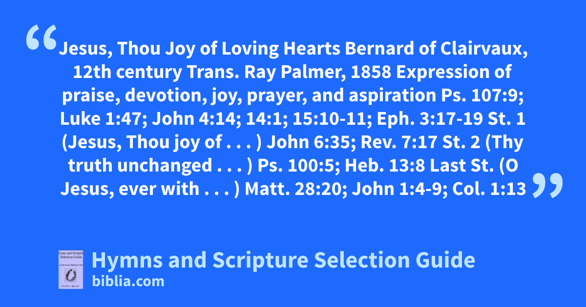 Jesus, Thou Joy of Loving Hearts Bernard of Clairvaux, 12th century Trans. Ray Palmer, 1858 Expression of praise, devotion, joy, prayer, and aspiration Ps. 107:9; Luke 1:47; John 4:14; 14:1; 15:10-11; Eph. 3:17-19 St. 1 (Jesus, Thou joy of . . . ) John 6:35; Rev. 7:17 St. 2 (Thy truth unchanged . . . ) Ps. 100:5; Heb. 13:8 Last St. (O Jesus, ever with . . . ) Matt. 28:20; John 1:4-9; Col. 1:13