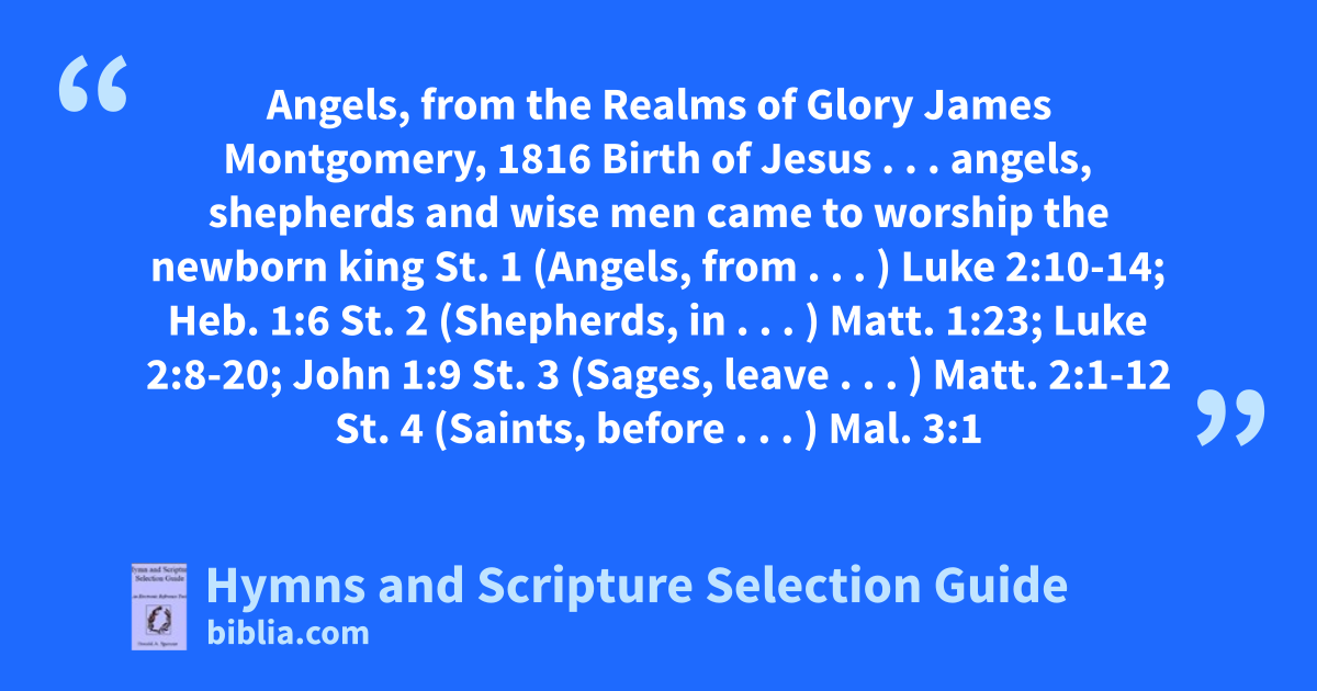 Angels, from the Realms of Glory James Montgomery, 1816 Birth of Jesus . . . angels, shepherds and wise men came to worship the newborn king St. 1 (Angels, from . . . ) Luke 2:10-14; Heb. 1:6 St. 2 (Shepherds, in . . . ) Matt. 1:23; Luke 2:8-20; John 1:9 St. 3 (Sages, leave . . . ) Matt. 2:1-12 St. 4 (Saints, before . . . ) Mal. 3:1