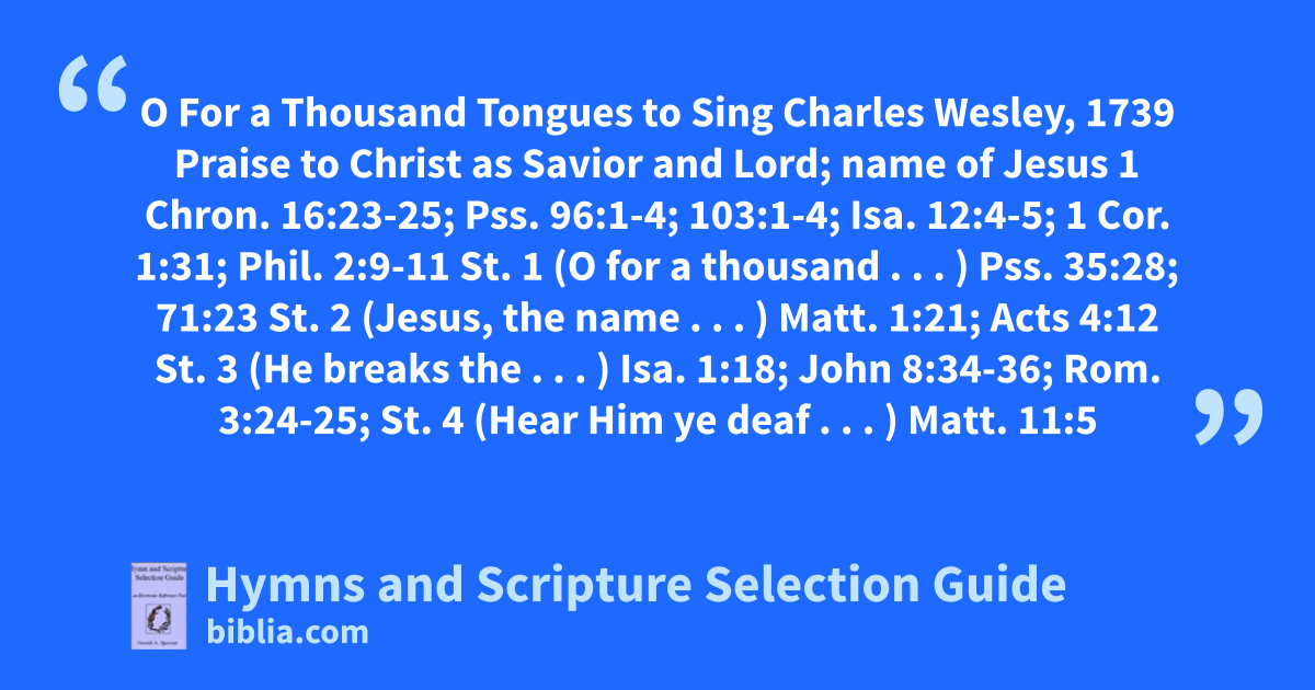 O For a Thousand Tongues to Sing Charles Wesley, 1739 Praise to Christ as Savior and Lord; name of Jesus 1 Chron. 16:23-25; Pss. 96:1-4; 103:1-4; Isa. 12:4-5; 1 Cor. 1:31; Phil. 2:9-11 St. 1 (O for a thousand . . . ) Pss. 35:28; 71:23 St. 2 (Jesus, the name . . . ) Matt. 1:21; Acts 4:12 St. 3 (He breaks the . . . ) Isa. 1:18; John 8:34-36; Rom. 3:24-25; St. 4 (Hear Him ye deaf . . . ) Matt. 11:5