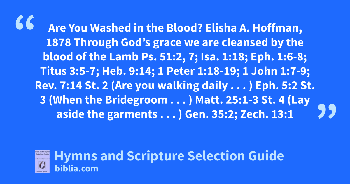 Hymn and Scripture Selection Guide - presents the 432 hymns in alphabetical order. The related Scripture passages, taken from the Old and New Testaments as commonly in use by American Protestant denominations, are listed under each hymn. Passages that are directly related to a hymn, such as paraphrases and direct quotations, are in boldface type. Under the title of each hymn in italics there are...