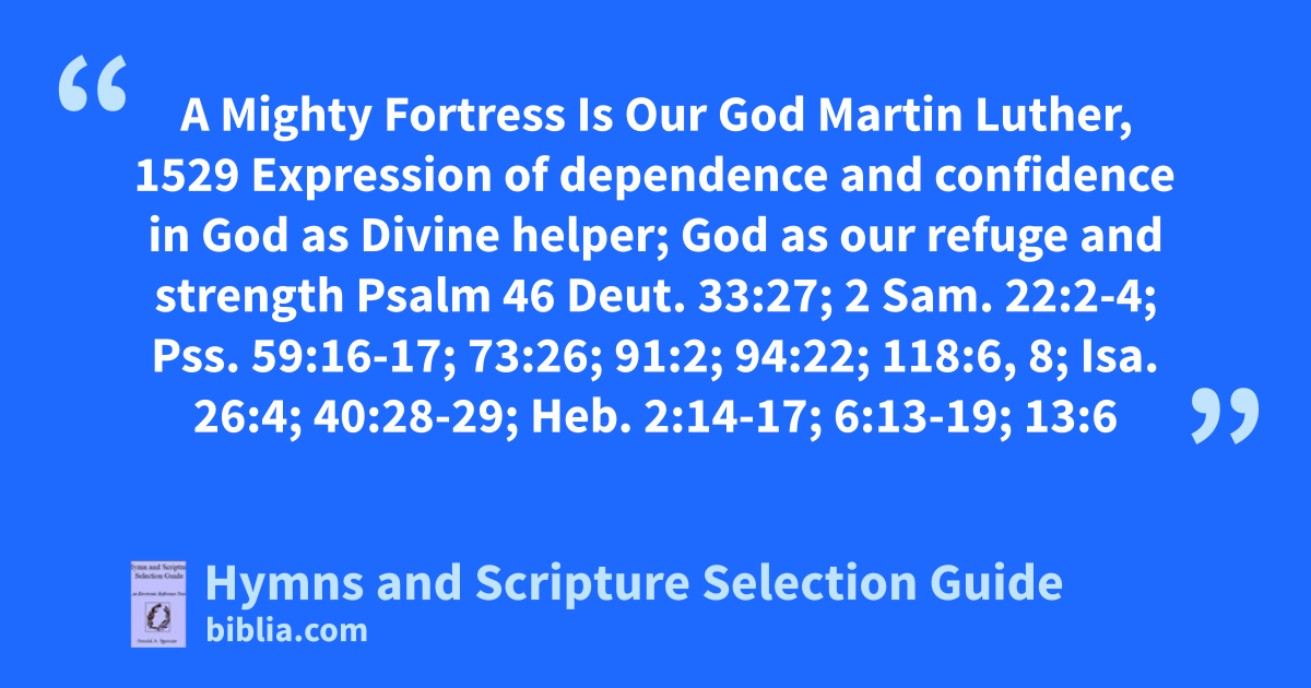 A Mighty Fortress Is Our God Martin Luther, 1529 Expression of dependence and confidence in God as Divine helper; God as our refuge and strength Psalm 46 Deut. 33:27; 2 Sam. 22:2-4; Pss. 59:16-17; 73:26; 91:2; 94:22; 118:6, 8; Isa. 26:4; 40:28-29; Heb. 2:14-17; 6:13-19; 13:6