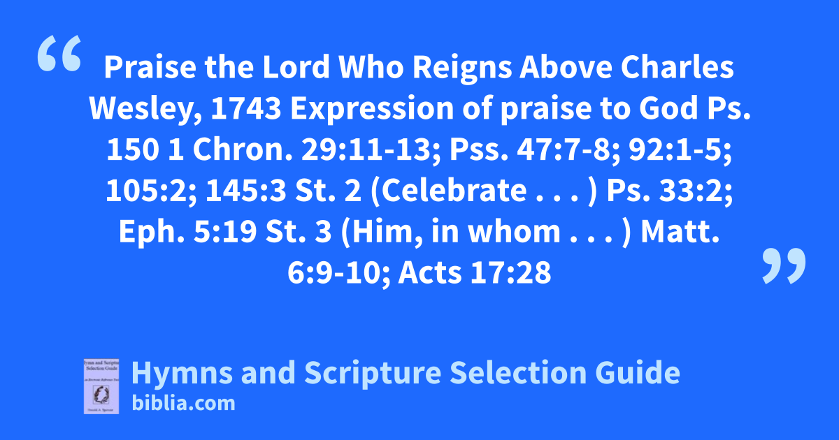 Praise the Lord Who Reigns Above Charles Wesley, 1743 Expression of praise to God Ps. 150 1 Chron. 29:11-13; Pss. 47:7-8; 92:1-5; 105:2; 145:3 St. 2 (Celebrate . . . ) Ps. 33:2; Eph. 5:19 St. 3 (Him, in whom . . . ) Matt. 6:9-10; Acts 17:28