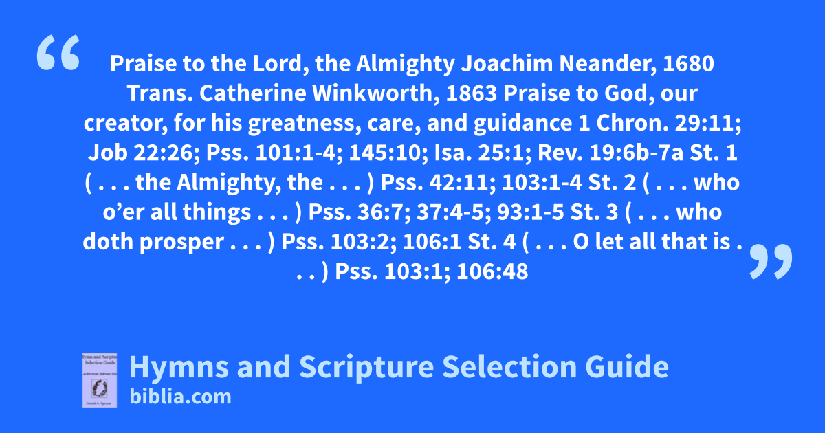 Praise to the Lord, the Almighty Joachim Neander, 1680 Trans. Catherine Winkworth, 1863 Praise to God, our creator, for his greatness, care, and guidance 1 Chron. 29:11; Job 22:26; Pss. 101:1-4; 145:10; Isa. 25:1; Rev. 19:6b-7a St. 1 ( . . . the Almighty, the . . . ) Pss. 42:11; 103:1-4 St. 2 ( . . . who o’er all things . . . ) Pss. 36:7; 37:4-5; 93:1-5 St. 3 ( . . . who doth prosper . . . ) Pss. 103:2; 106:1 St. 4 ( . . . O let all that is . . . ) Pss. 103:1; 106:48