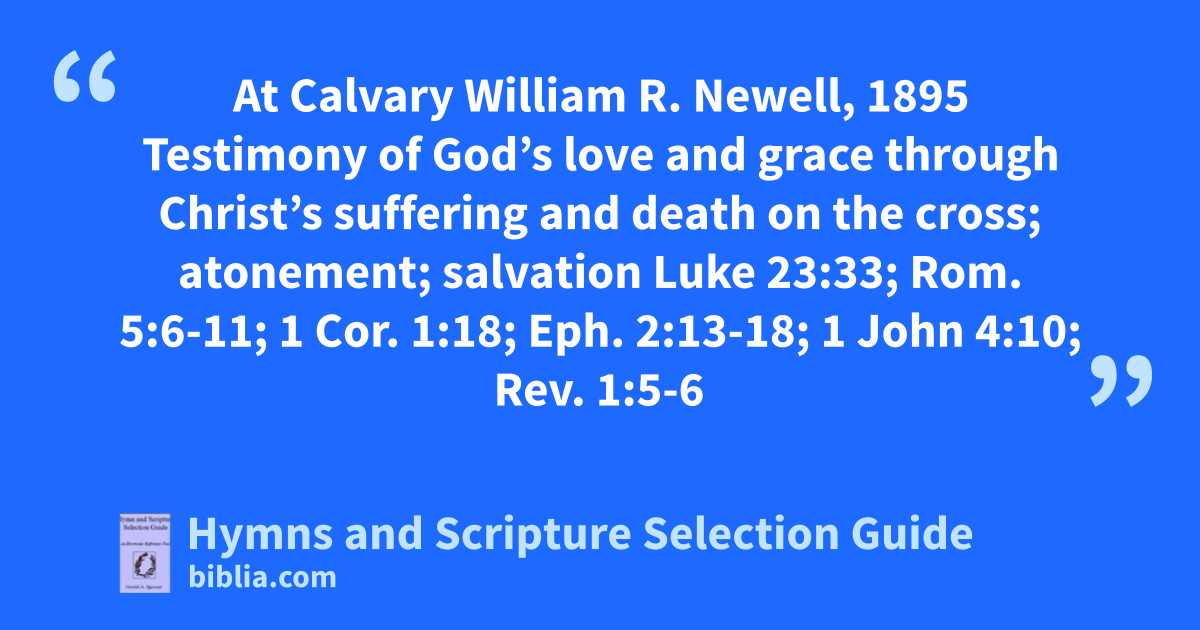 At Calvary William R. Newell, 1895 Testimony of God’s love and grace through Christ’s suffering and death on the cross; atonement; salvation Luke 23:33; Rom. 5:6-11; 1 Cor. 1:18; Eph. 2:13-18; 1 John 4:10; Rev. 1:5-6
