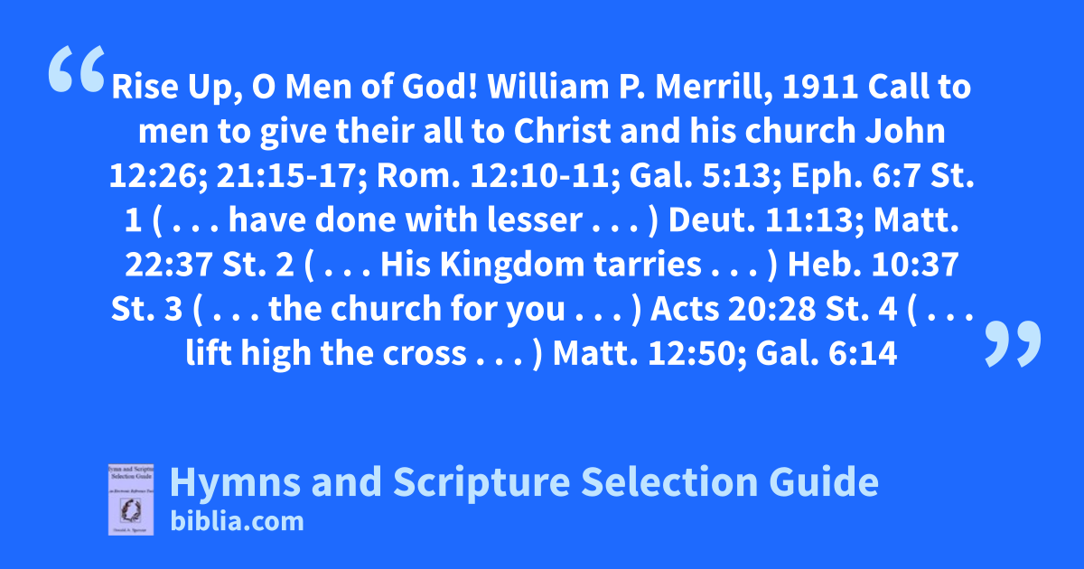 Rise Up, O Men of God! William P. Merrill, 1911 Call to men to give their all to Christ and his church John 12:26; 21:15-17; Rom. 12:10-11; Gal. 5:13; Eph. 6:7 St. 1 ( . . . have done with lesser . . . ) Deut. 11:13; Matt. 22:37 St. 2 ( . . . His Kingdom tarries . . . ) Heb. 10:37 St. 3 ( . . . the church for you . . . ) Acts 20:28 St. 4 ( . . . lift high the cross . . . ) Matt. 12:50; Gal. 6:14