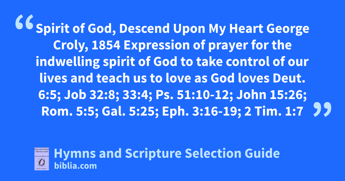 Spirit of God, Descend Upon My Heart George Croly, 1854 Expression of prayer for the indwelling spirit of God to take control of our lives and teach us to love as God loves Deut. 6:5; Job 32:8; 33:4; Ps. 51:10-12; John 15:26; Rom. 5:5; Gal. 5:25; Eph. 3:16-19; 2 Tim. 1:7